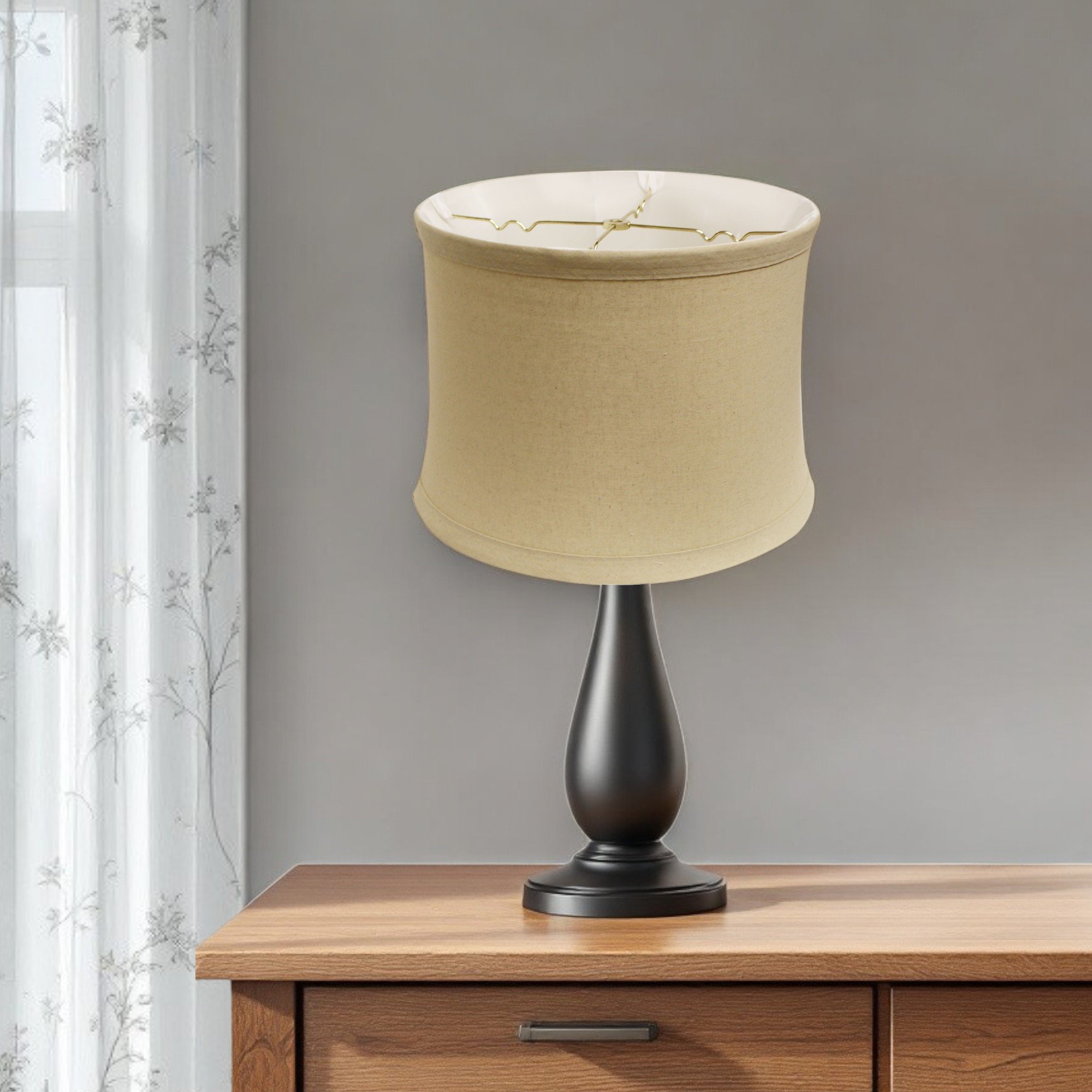 This Rosewood Drum Trimmed Linen Lampshades has a hint of mid-century modern flair and will be a great addition to your lamp base. This softback lampshade includes a standard washer fitter that fits over a standard harp and can be used with your existing finial design. This high quality crafted drum shape has a slight slant to give it some visual interest and is crafted of the finest linen with a fold on top and bottom of the shade. 11" x 15" x 15"